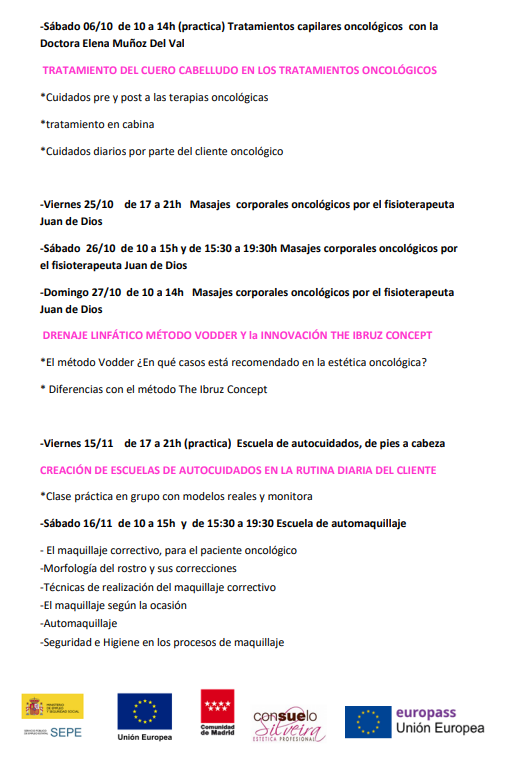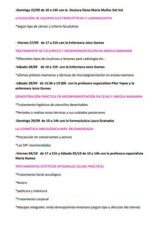 Contaremos en este programa de 120h presenciales y prácticas,  con la participación de facultativos especializados en medicina oncológica, como la doctora Elena Muñoz del Val, la licenciada en farmacia Laura Granados, la enfermera especialista en cicatrización y areola mamaria Joyce Gonzales, el psicólogo especialista Alex Risco González y el cuadro de profesoras de estética e imagen personal de la escuela Consuelo Silveira.